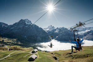 Hier kommen Adrenalin-Junkies voll auf ihre Kosten. Mit dem First-Flieger können bis zu vier Personen von der Gipfelstation First 800 Meter den Berg runter nach Schreckfeld sausen. Hierbei werden Geschwindigkeiten von bis zu 84 Km/h erreicht. Mit einer speziellen Sitzkonstruktion, die an Stahlseilen befestigt ist, sind sie gut gesichert. Die Talfahrt wird durch eine Federkonstruktion gestoppt. Dieses Flugerlebnis ist mitnichten etwas für Zartbesaitete, dagegen kommen Erlebnishungrige hier voll auf ihre Kosten: Kick inklusive. Ganz nebenbei genießt man auf dem Gipfel eine wunderbare Aussicht auf das Wetterhorn, das Schreckhorn, den Eiger und andere Berge der Berner Alpen. Info: Das Mindestgewicht beim First-Flieger ist bei 35 Kilogramm, das Maximalgewicht beträgt 125 Kilogramm.
