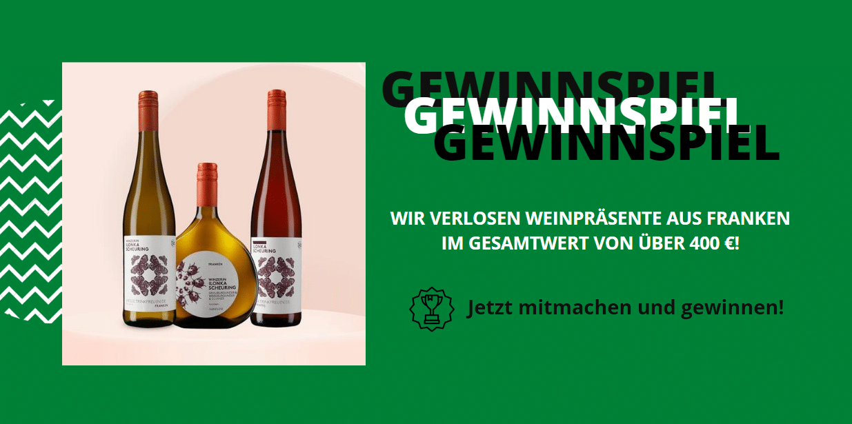 Winzertradition und höchsten Weingenuss verspricht das fränkische Weinanbaugebiet. Hier gibt es ohne Zweifel die besten Silvaner der Welt! Mediterranes Klima, heimelige Ortschaften und malerische Landschaften zeichnen diese sonnenverwöhnte Region aus. Wir verlosen 8 attraktive Weinpakete aus Franken.