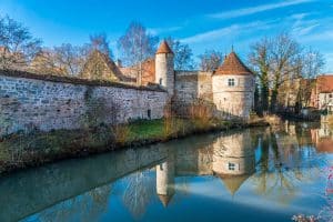 Dinkelsbühl ist eine Stadt in Mittelfranken, die architektonisch außergewöhnlich gut erhalten ist und viele Gebäude aus dem Spätmittelalter beherbergt. Diese machen den besonderen Flair der Stadt im Landkreis Ansbach aus. Die Stadt an der Wörnitz nennt sich nicht umsonst „schönste Altstadt Deutschlands“. Besonders prägnant im Stadtbild ist die Stadtmauer, die im Nordwesten und Südosten verläuft. Im Osten begrenzt der Mühlgraben die Stadt. Die Altstadt wirkt dadurch sehr geschützt und wird als sehr romantisch charakterisiert.