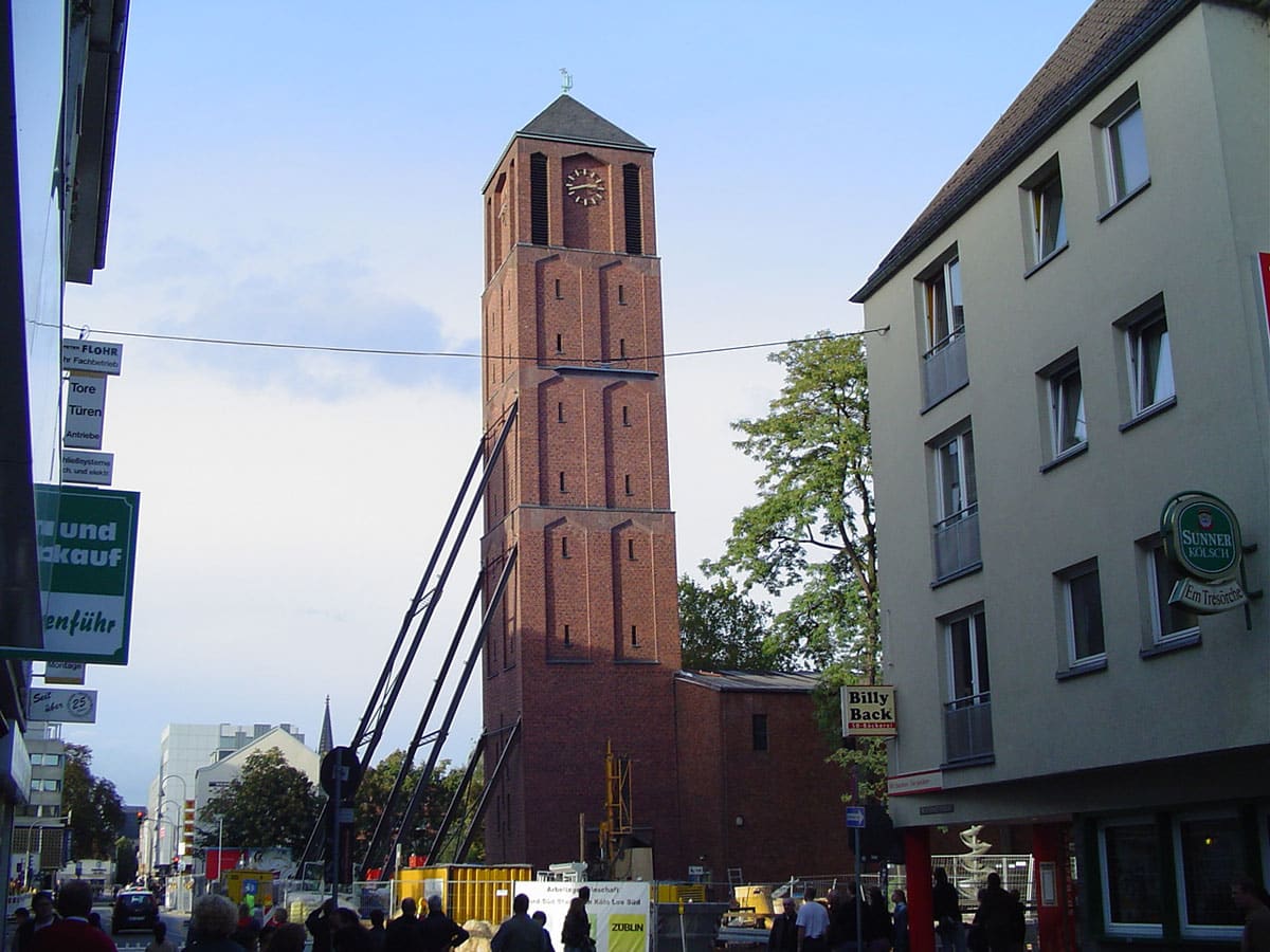 Der achiefe Turm von Köln ist leider kein schiefer Turm mehr und Köln um eine Touristenattraktion ärmer, berichtet Sabine Kwapik (dpa) im Jahr 2005. Der Turm der romanischen Kirche St. Johann Baptist wurde im Jahr 2005 begradigt und mit vier Hydraulikpressen wieder ins Lot gebracht. Aus dem ehemals schiefen Turm ist daher ein gewöhnlich-gerader geworden, doch seine schiefe Geschichte wird ihm ewig anhaften.