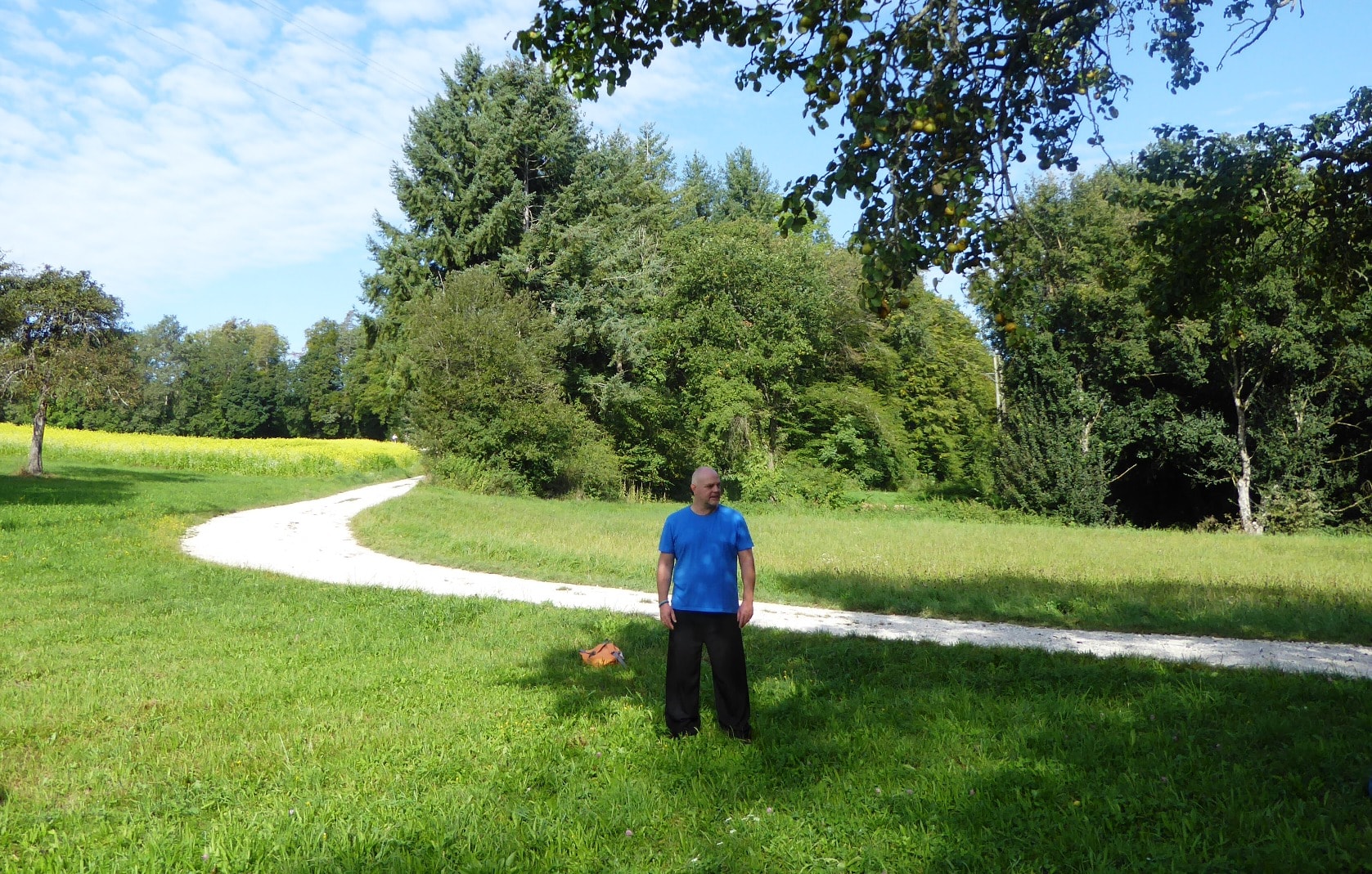 Auf einer Obstbaumwiese am Weg zum See lernen die Qigong-Wanderer die ersten Lockerungsübungen kennen. Die fließenden Bewegungen des Qigong werden mit Hilfe von Bildern erklärt, die man leicht nachempfinden kann.