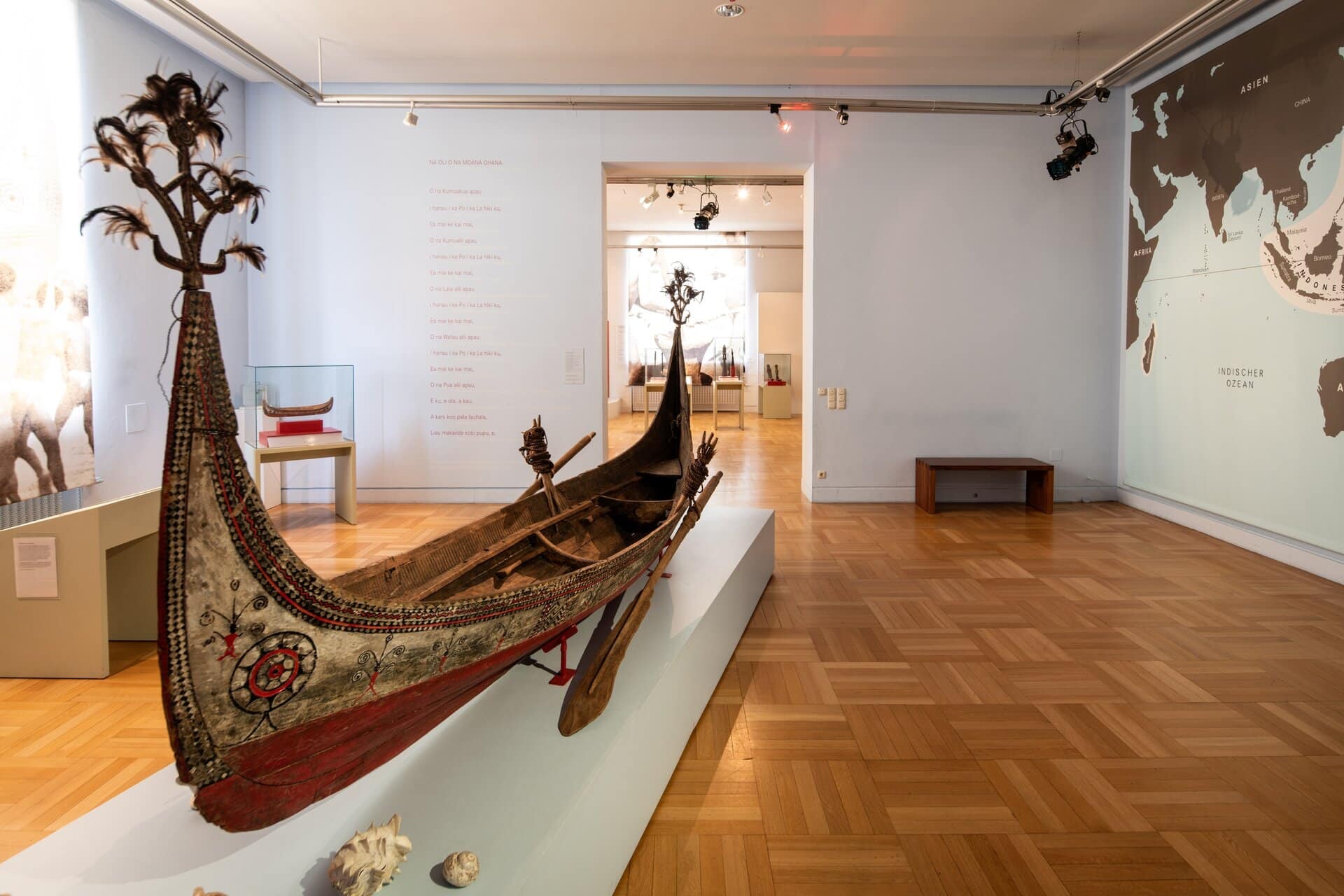 Ozeanien. Inselwelten im Pazifik: Über die Weiten des großen Kulturraums Ozeanien verteilen sich mehr als 7.500 Atolle und Inseln. Die Ausstellung zeigt weltweit einzigartige Objekte wie das reich verzierte Fischerboot aus Botel Tobago, die kunstvolle Stabkarte von den Marshall-Inseln oder bemalte Paddel von den Salomonen. Zudem kann man Malanggan-Masken aus Neuirland, Zeremonialbretter aus Papua-Neuguinea oder Ahnenfiguren von den Cook-Inseln bewundern.