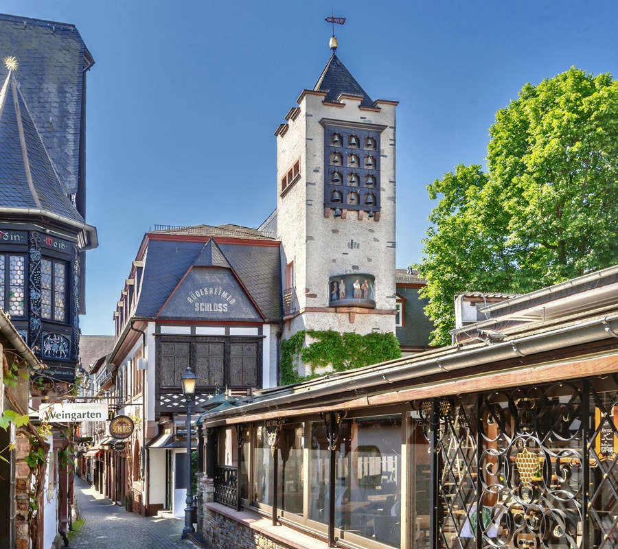 Gemütliche Weinstuben, ein sonniger Wintergarten und ein romantischer Schlossgarten erwarten Sie im traditionsreichen Weingasthaus in der Drosselgasse. Hier kann man sich zu regionalen und hauseigenen Spezialitäten Riesling und Spätburgunder vom Weingut GEORG BREUER und Rheingauer Winzern schmecken lassen. Die monatlich wechselnde Speisekarte hält Schmackhaftes wie Rieslingkäsesuppe, Bratwurst vom Rüdesheimer Wildschwein, Handkäs mit Musik oder „Hessisch Tapas“ bereit. Mittags und abends wird täglich Live-Musik geboten.