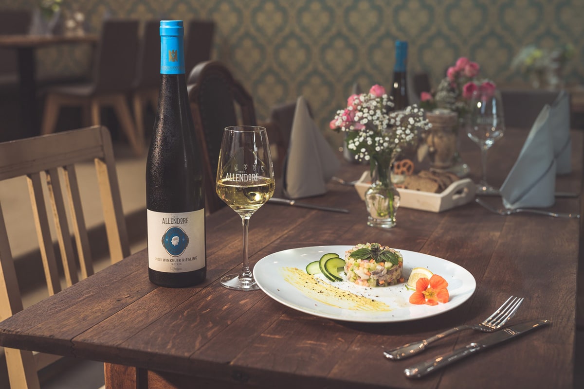 Das 1751 erbaute Haus im Ortskern von Winkel gilt als das Zentrum der Rheinromantik und diente unter anderen der Familie Brentano und ihren Freunden Johann Wolfgang von Goethe, den Gebrüdern Grimm und dem Freiherrn vom Stein als Sommerresidenz – Goethes Zimmer sind sogar noch original erhalten. Hier bietet Familie Allendorf neben hauseigenen Weinen regionale Rheingauer Sonntagsküche mit mediterranem Einfluss. Schön sitzt man auf der südländischen Piazza zwischen einem 150 Jahre alten Olivenbaum und zwei historischen Brunnen.