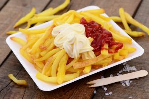 Ursprünglich wurde die Currywurst zwar in Berlin erfunden, doch im Ruhrgebiet hat sich durch die vielen Arbeiter, die nach ihrer Schicht schnell noch etwas essen wollten, eine richtiggehende Imbisskultur entwickelt: an jeder Ecke findet man eine Wurst- oder Imbissbude, und jeder Einwohner des Ruhrgebiets kann wahrscheinlich seine favorisierte Currywurstbude in der Nähe benennen. Im Ruhrgebiet wird die Wurst, der schon Herbert Grönemeyer ein Lied widmete, extra scharf gegessen, und die traditionelle Beilage sind „Pommes Schranke“, also Pommes frites mit Ketchup und Mayonnaise. „Schranke“ ist eine Wortschöpfung aus dem Ruhrpott und bezieht sich auf die rot-weiße Färbung der Bahnschranken.