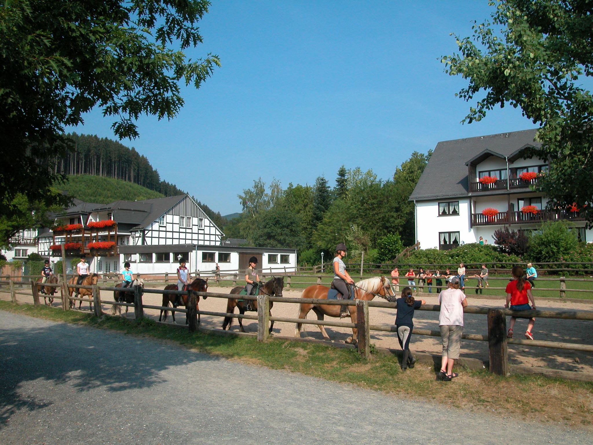Urlaub für die ganze Familie im Herzen des Sauerlandes – dafür steht der Ponyhof Meier in Eslohe. Eltern und Kinder finden hier kleine und große Ponys, viele Streicheltiere, leckeres Essen und jede Menge Platz zum Spielen. Für Pferdefreunde bietet man Reitunterricht in der Reithalle, Schnupperreiten am Anreisetag, geführtes Ponyreiten, Ponywanderungen sowie Ausritte für Fortgeschrittene an. Für die Erwachsenen, die etwas Ruhe neben dem Ponygewusel nötig haben, gibt es einen Wellnessbereich mit finnischer Sauna, einer Infrarotsauna, einem Fußbecken, einer Erlebnisdusche, ein paar Liegen und einem Strandkorb.