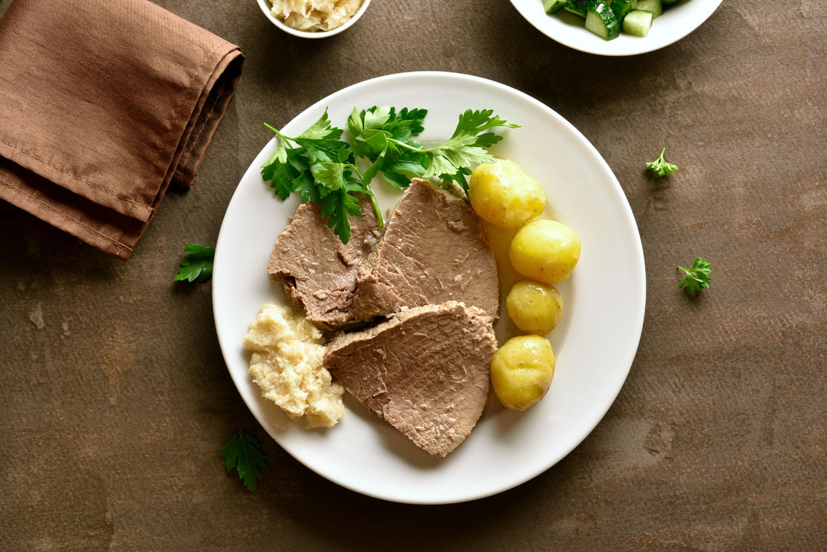 Das leckere gekochte Rindfleisch geht eine Symbiose mit der Meerrettichsoße ein. Hier scheiden sich die Geister: Entweder man verehrt Omas Tafelspitz mit Kartoffeln – oder es wird kein Festessen daraus und man muss sich auf den süßen Nachtisch konzentrieren.