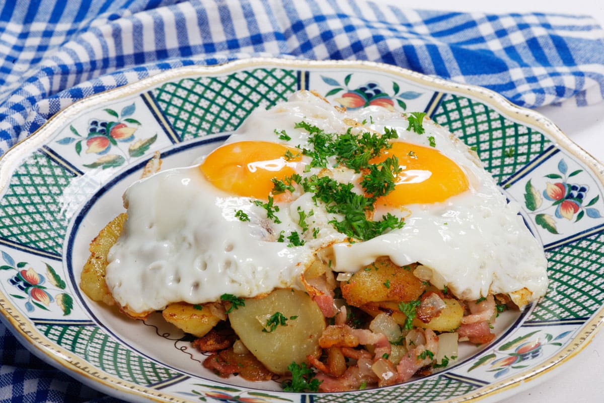 Das Tiroler Gröstl ist ein österreichisches herzhaftes Pfannengericht, das aus gekochten Kartoffeln, Speck, Zwiebeln und Spiegeleiern besteht. Es mutet zwar hinsichtlich der Herstellung simpel an, doch das Gröstl hat es kulinarisch in sich. Oh wie lecker, Ö wie Österreich.