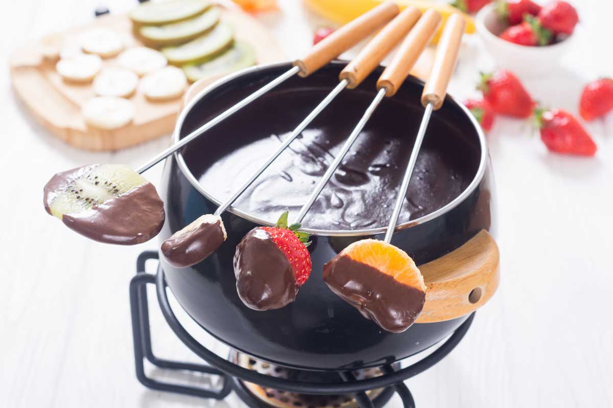 Als süße Variante bietet sich das Schokofondue an. Hier wird Vollmilch- oder Zartbitterschokolade (vorbereitend im Wasserbad) geschmolzen; es gibt auch die Variante mit weißer Schokolade. Vorbereitete Obststückchen werden wie beim Fondue üblich in die warme Schokoladensoße getunkt, beispielsweise Erdbeeren, Ananas, Banane und so weiter. Je höher der Fettgehalt, umso besser schmilzt die Schokolade. Hier können auch verschiedenste Ideen verwirklicht werden, so etwa die Verfeinerung mit einem Schuss Espresso oder Amaretto o. Ä.. Spätestens beim Schokofondue schmelzen Sie dann endgültig dahin.