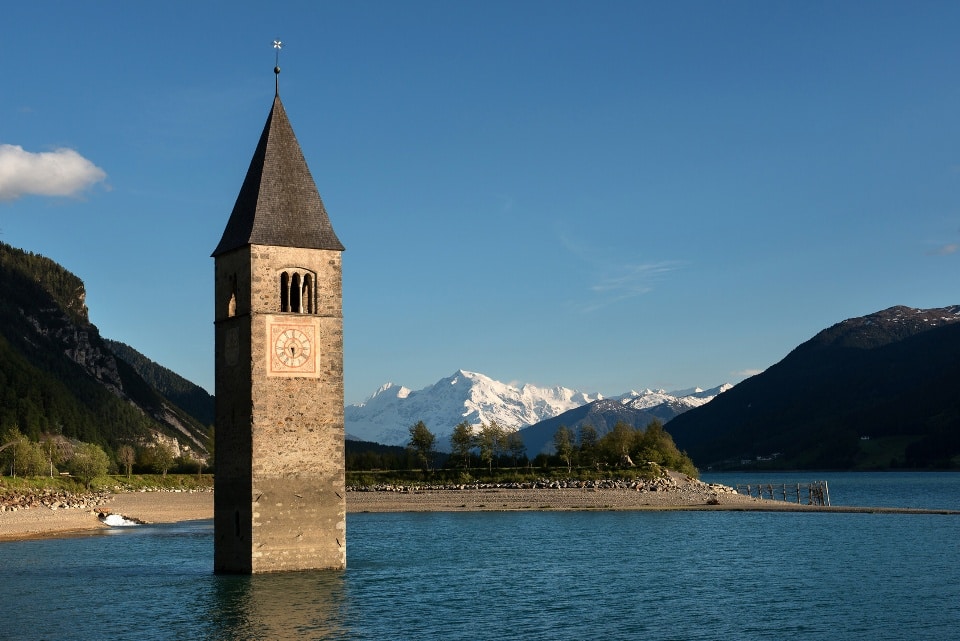 Zwischen 1.900 Meter und 3.250 Meter erstreckt sich in großartiger Berg- und Gletscherwelt das Skigebiet Sulden am Ortler. Schneesicherheit von Oktober bis Mai ist durch leistungsfähige Schneeanlagen garantiert. Sie erreichen das Skigebiet mit modernsten Bergbahnen. Seit 2003 ist hier die größte Luftseilbahn der Alpen in Betrieb. Auch Nicht-Wintersportler werden von den spektakulären Ausblicken auf die Ötztaler Alpen, den glitzernden Seenlandschaften und den mächtigen Dolomitengipfeln mit Grödnertal und Pustertal begeistert sein. Der 6 km lange Reschensee liegt am nördlichen Ende des Vinschgaus. Hier wurden 1950 der Ort Graun und einige Weiler überflutet, um einen Stausee zur Stromerzeugung zu gewinnen. Das Wahrzeichen der Region ist der aus dem Wasser ragende Kirchturm. Die günstigen Winde am See locken in den Sommermonaten Kite-Surfer, im Winter Eissegler und Snowkiter.