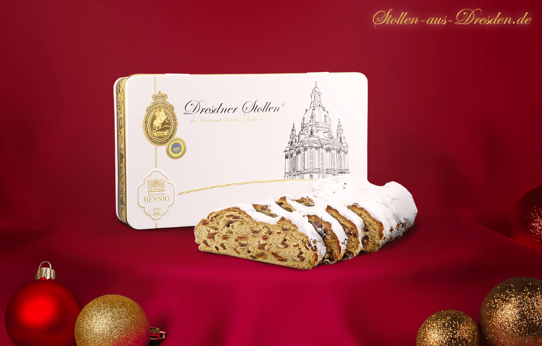 Der Original Dresdner Stollen ist in Deutschland und über die Landesgrenzen hinaus das wohl bekannteste Weihnachtsgebäck mit dem größten traditionellen Hintergrund und einer weit zurückreichenden Historie. In Dresden erschien der Begriff „Christstollen“ das erste Mal im Jahr 1474 auf einer Rechnung an den Dresdner Hof. Seit jeher hat sich die einzigartige Backform des Christstollens nicht verändert und erinnert noch heute an das gewickelte Christkind, so erklärt sich auch der weiße Puderzucker. Ausgewählte Zutaten des Dresdner Christstollens und eine seit Generationen überlieferte Familienrezeptur machen den Dresdner Christstollen zu dem, was er heute ist: ein Meisterwerk der Backkunst.