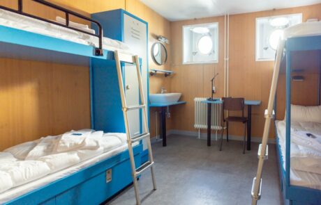 Das Arcona Hostel in Wilhelmshaven bietet Übernachtungen der besonderen Art, denn die Arcona ist ein ausgedientes Marineschiff, das im Hafen vor Anker liegt und Schlafplätze in Form von Kajüten anbietet.