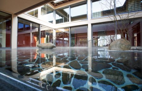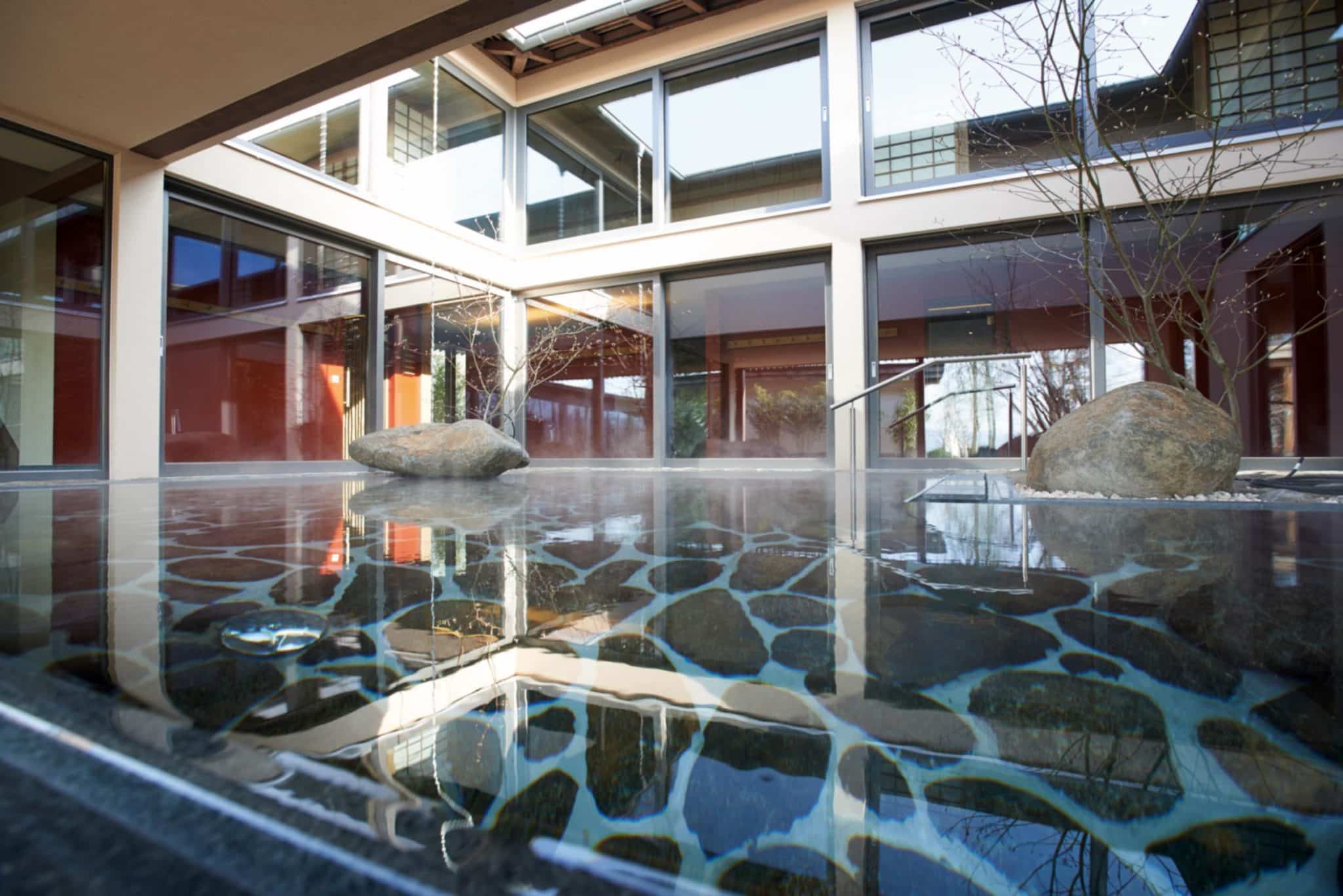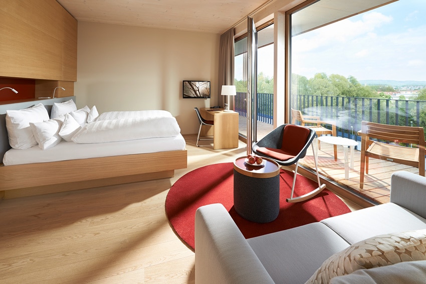 Doch nicht nur was das Saunaerlebnis angeht ist der Anspruch des Hausherren hoch. Das moderne Design mit der fachwerkartigen Alu-Glas-Holzfassade und den großzügigen Rundumbalkonen ist geschmackvoll auf das Interieur abgestimmt. Hochwertige Naturmaterialien und ein konsequent durchgezogener, großzügiger Stil mit viel Holz geben dem Emsemble ein besonderes, modernes und zugleich wohnliches Flair. Die Zimmer sind geräumig und haben alle Balkonzugang. Nachhaltigkeit findet nicht nur bei der Heizung statt, die zum Teil aus Erdwärme und über Solarenergie erfolgt. Auch die Naturkosmetiklinie „Stop the Water“ auf den Zimmern weist Gäste aktiv darauf hin, verantwortungsvoll mit der Ressource Wasser umzugehen. Das Hotel ist mit dem Green-Sign-Nachhaltigkeitssiegel auf Level 4 von 5 ausgezeichnet.