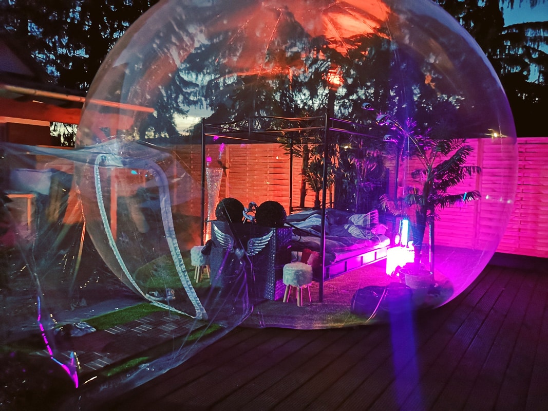 Das besondere Hotel befindet sich in der Eifel, genauer gesagt zwischen Gerolstein und Prüm, ist eigentlich eine Gratiszugabe zu einer Übernachtung in einem Luxusapartment im Eifelhaus24 – oder umgekehrt. Die Bubble ist tatsächlich eine riesige Blase aus Plastik, die freien Blick in den Sternenhimmel erlaubt und dabei ziemlich viel Luxus zu bieten hat. Das Bubble-Hotel bietet für jede Bubblebuchung einen privaten, abschließbaren und uneinsehbaren Wellnessbereich mit Außenwhirlpool, Bubble und Sauna – von 19 Uhr abends bis 10 Uhr morgens. Der private Wellnessbereich ist zur Wahrung der Privatsphäre vom Apartment räumlich getrennt und damit gegen fremde Blicke geschützt. Jedes Apartment hält ein Bad mit Dusche, WC, einen Kamin, eine vollausgestattete Küche und ein Doppelbett bereit. Wer in der Bubble nächtigt, wird mit einem ganz besonderen Naturerlebnis belohnt, das man exklusiv mit seinem Partner genießen kann. Das Hotel ist ein außergewöhnliches Glampingabenteuer für naturliebende Paare, die ihre Privatsphäre und etwas Luxus zu schätzen wissen.