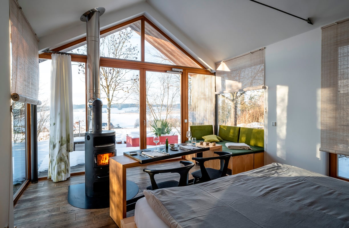 Zwischen Wiesen und Feldern offenbart sich mit dem Hofgut Hafnerleiten ein Rückzugsort mit Abschaltgarantie: Die verschiedenen Themenhäuser fügen sich nicht nur harmonisch in die umliegende Landschaft ein, sie sind ein Teil von ihr. Große Fenster geben den Blick nach draußen frei und holen so die unberührte Natur ins Innere. Ob in der freistehenden Badewanne mit Aussicht oder in der Leseecke neben dem Kamin, Ruhesuchende kommen ganz und gar im Hier und Jetzt an. Wer sich bewusst für Digital Detox entscheidet, der ist hier richtig: Die Umgebung ist frei von Elektrosmog, das Hofgut liegt in einem natürlichen Funkloch. Kein Radio, kein Handyempfang, kein Fernseher, kein Internet. Dafür Bücher, CDs und jede Menge Zeit.