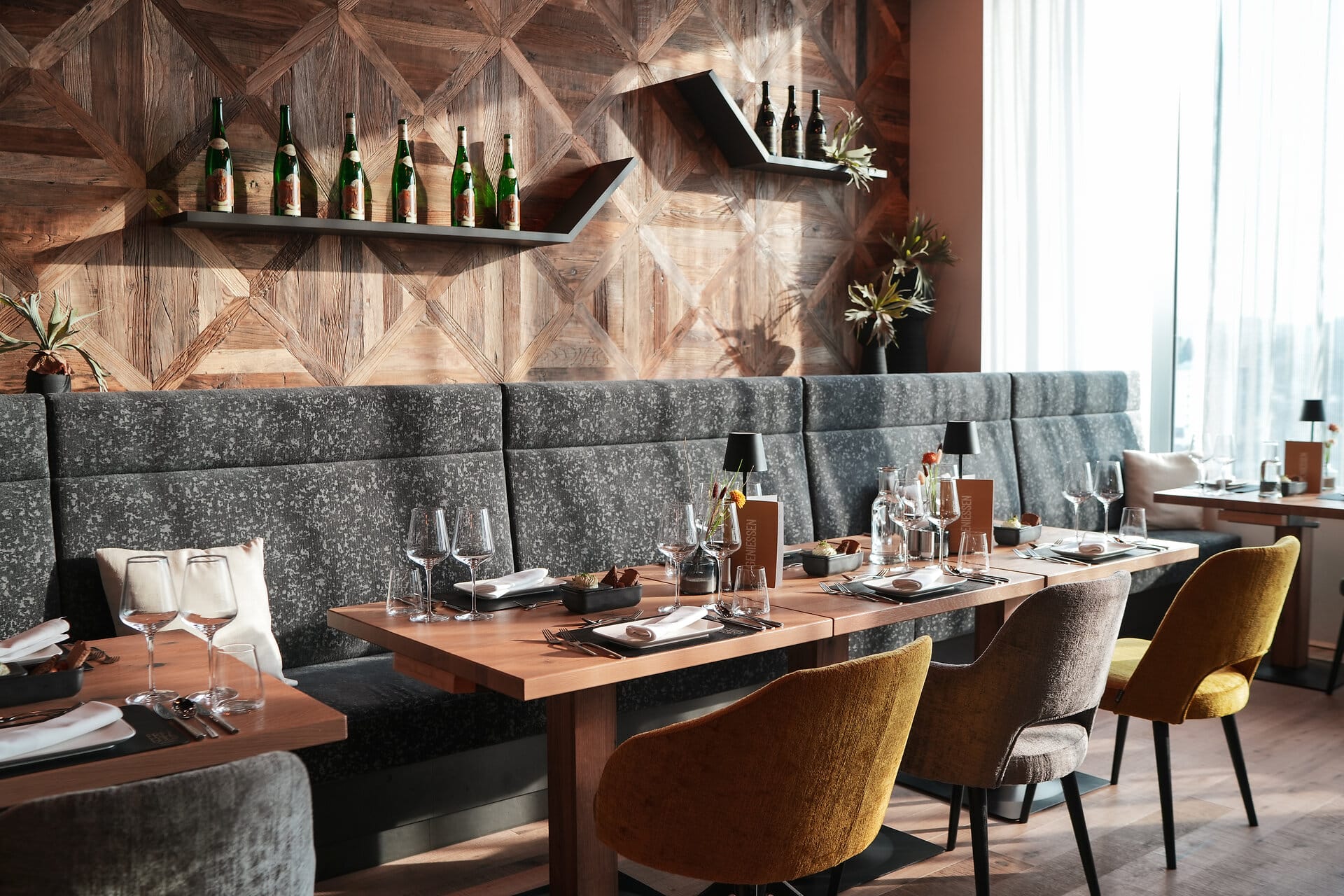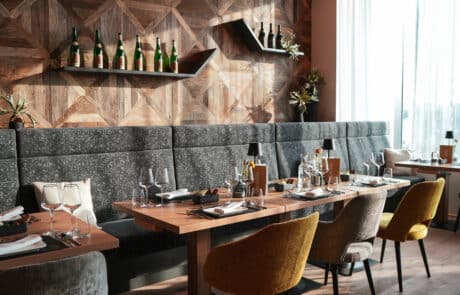 Auch der Genuss ist im Hotel Freigold nicht alltäglich: Das SKY-Restaurant in 40 Meter Höhe bietet kulinarische Highlights für den Gaumen und fürs Auge, mal klassisch, mal traditionell, aber immer neu gedacht und gesund. Aber auch hier wartet die ein oder andere Besonderheit und Überraschung auf den Gast: Das Essbesteck beispielsweise muss man erstmal suchen, und auch ein „klassisches“ Gänge-Abendmenü wie gewohnt gibt es nicht – stattdessen genießt man das Abendmenü auf Food-Sharing-Plates für zwei Personen. Vorspeisen, Hauptgerichte und Desserts müssen also geteilt werden. Zudem sind die Speisen vorwiegend vegetarisch – nur wer möchte kann sich zum Hauptgang ein Fisch- oder Fleischgericht bestellen. Der Hintergedanke dabei: ein kleiner Impuls an den Gast – denn warum nicht zur Abwechslung köstliche Gerichte probieren, bei denen man Fleisch oder Fisch gar nicht vermisst?