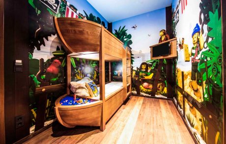 142 Zimmer im unverwechselbaren LEGO Design bietet das Pirateninsel Hotel im LEGOLAND auf einem Areal, das so groß ist wie sechs Fußballfelder. Das einmalige Piratenflair entfaltet sich zwischen Holzplanken, Piratentapete und zahlreichen LEGO Modellen. Das Besondere an dem neuen Hotel ist, dass überall LEGO Baukisten bereitstehen; sogar die einzigartigen Schlafschiffchen für die Kinder sind mit einer LEGO Bauplatte ausgestattet.