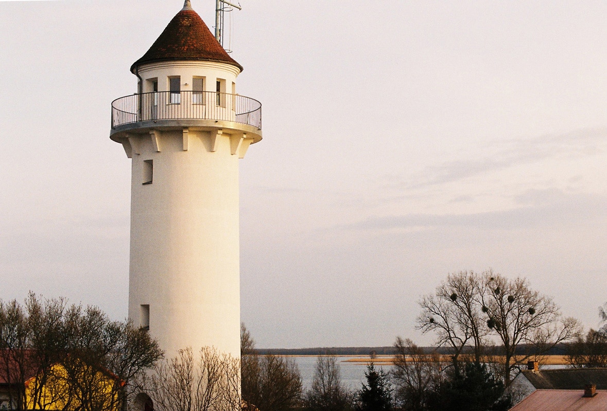 Im traumhaften Hinterland von Usedom, direkt am Wasser mit berauschendem Blick auf das Haff, steht der fast 70 Jahre alte Lotsenturm von Karnin. 1938 für bis zu sechs Lotsen erbaut, die die Schiffe vom Stettiner Haff unter der Karniner Eisenbahn-Hubbrücke sicher durch den Peenestrom bis an die Ostsee brachten, verlor der 22 m hohe Turm bereits 1945 seine Funktion, als die Eisenbahnbrücke gesprengt wurde. Einige Jahrzehnte lag der Turm im Dornröschenschlaf, bevor er 2008 als exklusives Zwei-Personen-Designhotel neues Leben eingehaucht bekam. Zu den Besonderheiten dieses besonderen Domizils zählen drei originell eingerichtete kreisrunde, je zwölf Quadratmeter große Räume, die aufwendig saniert wurden und zwei Übernachtungsgästen alle Annehmlichkeiten einer Hotelübernachtung bieten.