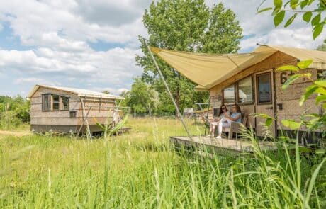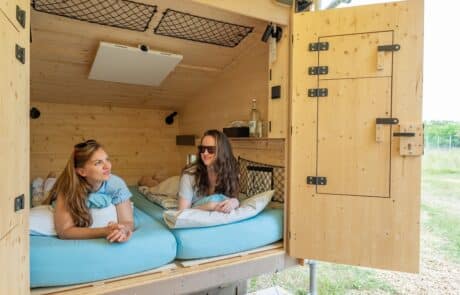 Eine destinature Hütte bietet Platz für Paare oder kleine Familien. Die Betten lassen sich zusammenschieben, ein drittes Bett hinzufügen und eine weitere Person findet im Extra-Bett eine gemütliche Schlafkoje. Jede Hütte hat eine eigene Terrasse, und in der destinature Hütte Plus gibt es sogar einen kleinen Extra-Bereich mit Waschplatz und Trockentoilette – für alle, die einen kurzen Weg zur Toilette bevorzugen. Das Bett to Go ist passend für alle, die Zelten zwar toll finden, aber den Komfort eines Bettes nicht missen möchten. Diese flexible und komfortable Übernachtungsmöglichkeit lässt sich dank der montierten Räder ganz einfach verschieben.