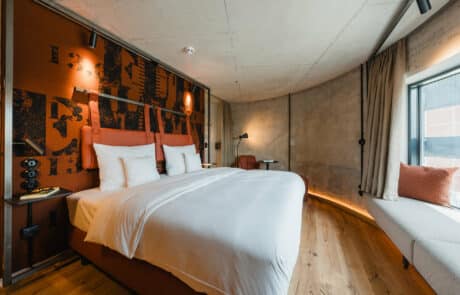 Was alle Zimmer gemeinsam haben: Sie sind zu fast einhundert Prozent nachhaltig gestaltet. Die Möbel sind zum Beispiel aus Kunstleder, recyceltem Leder oder Holz, es werden nur biologisch abbaubare Reinigungsmittel verwendet und fast alles ist digital – Papier wird weitestgehend vermieden. Wärme und Kälte kommt aus Weserwasser, aus den Steckdosen fließt Ökostrom, es gibt keine Fernseher, sondern High-Speed-Wlan zum Streamen, und auch auf eine energiefressende Minibar wurde verzichtet – stattdessen gibt’s rund um die Uhr kostenlose Wasserflaschen.