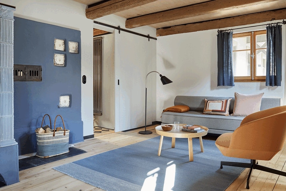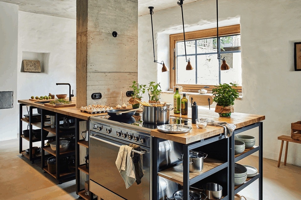 Die Kochwerkstatt war einst tatsächlich die frühere Werkstatt. Die große Küche ist ein Ort, wo Gäste gemeinsam mit Spaß zusammen kochen können. Hier und im Petit Salon gleich nebenan finden die Apéros statt, zu denen die Gastgeber regelmäßig ihre Gäste einladen. Le Petit Salon ist ein chilliger Loungebereich, in dem gelesen, gespielt und geplaudert wird. Hier finden die Gäste ausgewählte Reise- und Architekturliteratur, Wander- und Radkarten und sonstige hilfreiche Lektüre. Das Weingewölbe La Cave war früher die Werkstatt des Küfers – heute finden hier Weinproben mit befreundeten Winzern statt. Im gut temperierten Weinkühlschrank findet man eine Selektion ausgewählter regionaler Tropfen.