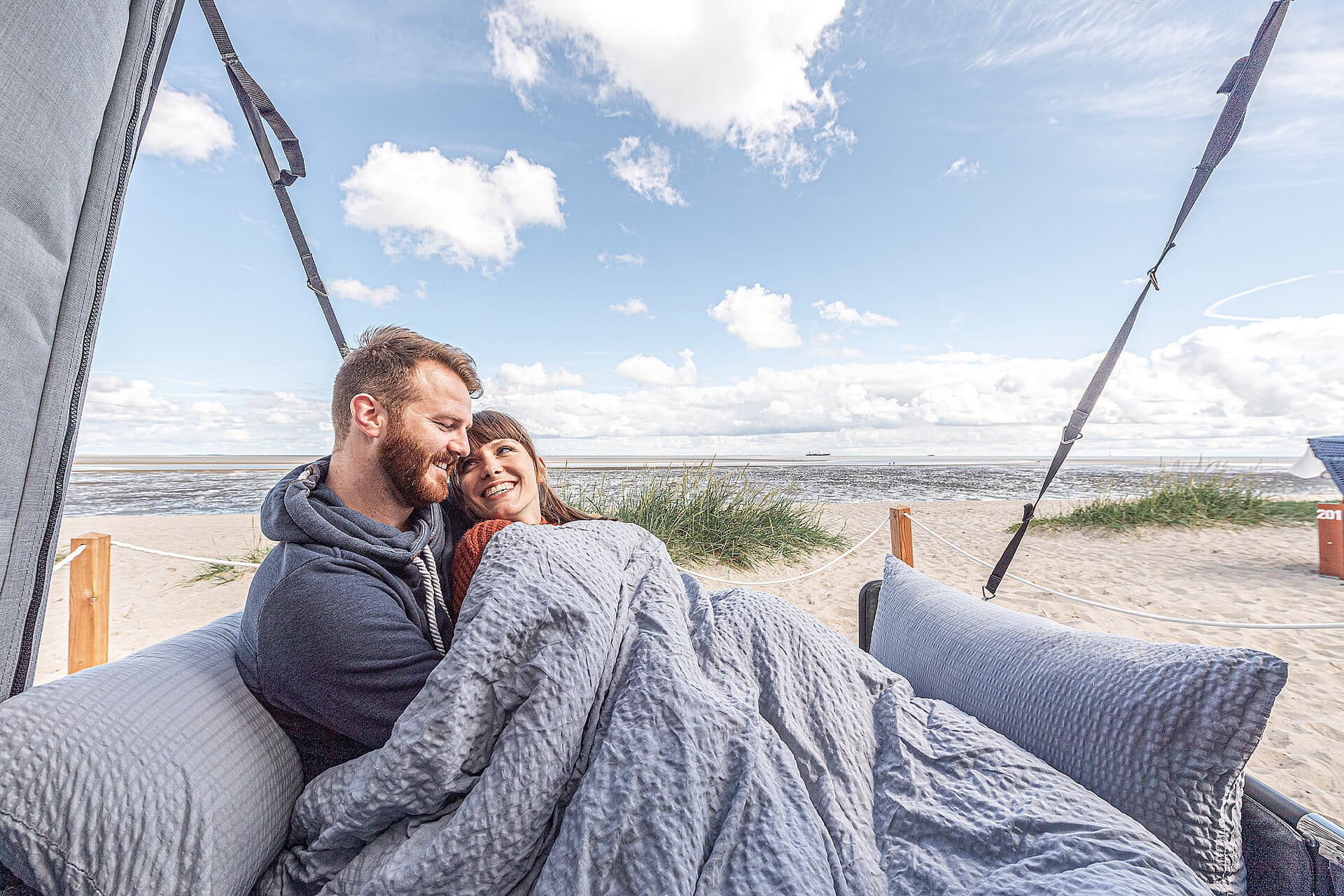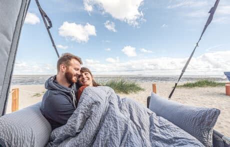 Zweisamkeit an der Nordseeküste erleben und einmal direkt am Nordseestrand übernachten: Die exklusiven Schlafstrandkörbe im Wangerland machen es möglich. Drei dieser besonderen Übernachtungsmöglichkeiten gibt es hier in Hooksiel und Schillig, die Platz für zwei Personen bieten. Tagsüber kann man das Verdeck vollständig öffnen, um die Sonnenstrahlen und das Gefühl der unendlichen Weite des Meeres zu genießen, und nachts träumt man unterm Sternenhimmel. Und auch bei Regen muss man nicht auf den Blick in den Himmel verzichten, dank der eingebauten Fenster im wind- und wasserfesten Verdeck.