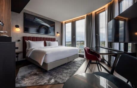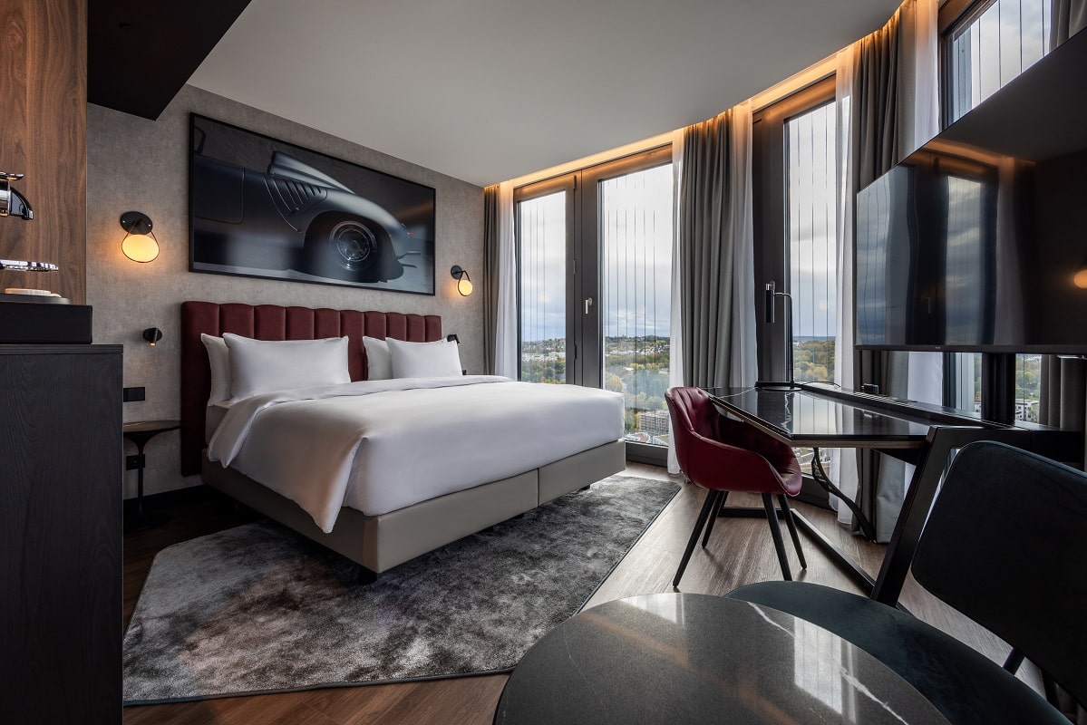 Die 168 Zimmer und Suiten sind sorgfältig und mit Liebe zum Detail gestaltet und bieten eine harmonische Mischung aus Komfort und Stil. Großzügige Grundrisse und eine zeitgemäße Einrichtung sorgen für Erholung – teils mit herrlicher Aussicht auf Stuttgart und die Weinberge. Zu den weiteren Annehmlichkeiten im Radisson Blu Hotel at Porsche Design Tower gehören ein rund um die Uhr geöffneter Fitnessbereich sowie mobile Arbeitsplätze in der Lobby. Der namensgebende Sportwagenhersteller ist überall präsent: In den Zimmern und den öffentlichen Flächen des Hotels hängen ästhetische Fotos von den Fahrzeugen.