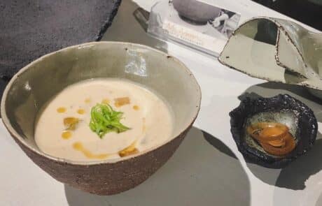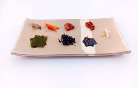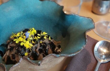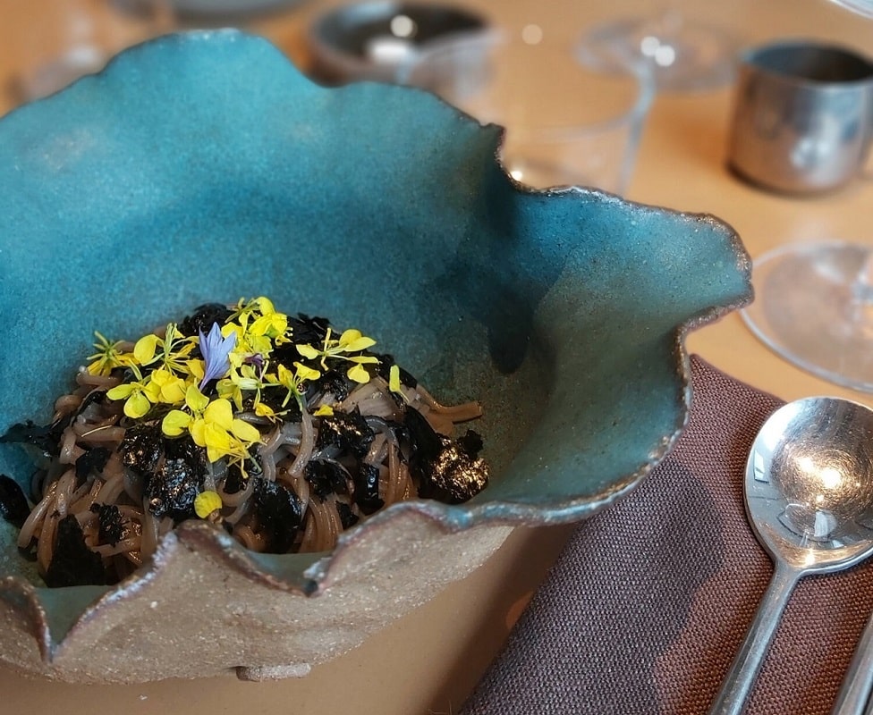 Die Küche im NaNum, das übersetzt so viel heißt wie „teilen“, hat ihren Ursprung in der koreanischen Tradition und entwickelt aus dem alten Wissen eine Vielzahl neuer und dennoch authentischer Gerichte, die überwiegend vegan, fleischreduziert und aromenreich daherkommen. Fermente und Essige aus Gravensteiner und Quitten, Kiefernnadeln und Aronia werden selbst hergestellt, viele Lebensmittel, die auf der eigens kreierten Keramik serviert werden, wachsen im eigenen Garten – insbesondere erntet man hier Obst, seltene Kräuter und Pflanzen und jede Menge Blumen –, man achtet auf nachhaltige Bezugsquellen. Begleitet werden die Speisen von Naturweinen – Weinen also, die sich von Jahrgang zu Jahrgang erheblich unterscheiden können, da sie nicht durch Zusatzstoffe angeglichen werden.