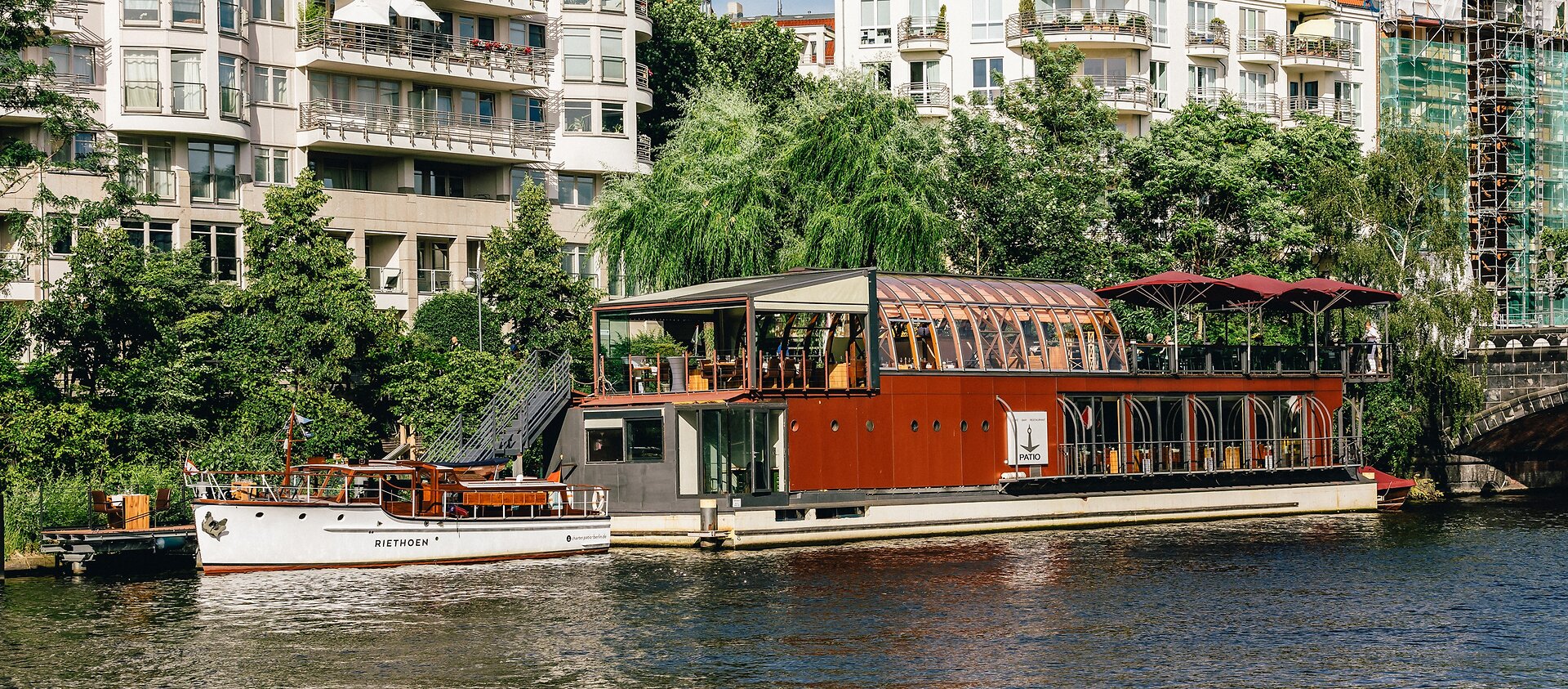 Ebenso unvergesslich ist das „PATIO Floating & Dinner“: Bei diesem Event genießt man ein exklusives Dinner im PATIO, kombiniert mit einer privaten Bootstour auf der Spree. Bei einer einzigartigen Fahrt auf dem 30er-Jahre Salonschiff RIETHOEN durch die historische Innenstadt von Berlin gleitet man entspannt an beleuchteten Sehenswürdigkeiten wie dem Berliner Dom und der Museumsinsel vorbei und lässt das frühabendliche Berlin auf sich wirken. Je nach Auslastung genießt man entweder vor oder nach der Fahrt ein exklusives Vier-Gänge-Menü auf dem Restaurantschiff – direkt am Wasser, mit persönlichem Service und kulinarischer Raffinesse.