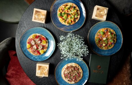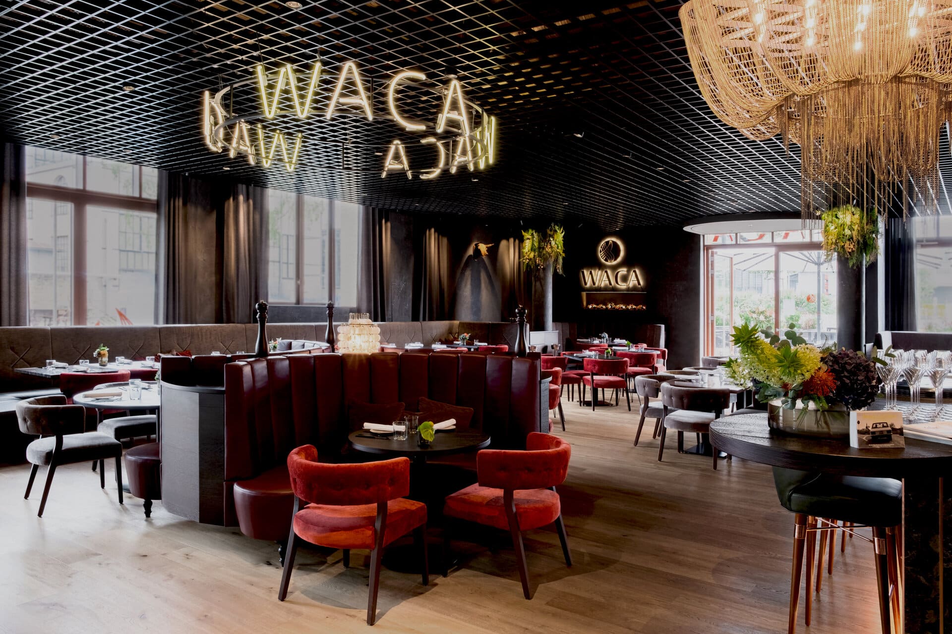 Dieses beeindruckende Interieur hat man im WACA mit glamouröser Eleganz und einem warmen Farbthema aus Kupfer, Braungrau und Moosgrün verbunden. Kulinarisch bietet man hier ein exzeptionelles, hochkarätiges Genuss- und Wohlfühlkonzept der Extra-Essklasse: Moderne Kreationen aus den geschmacksintensivsten Küchen der Welt fusionieren zu einem anspruchsvollen Casual-Fine-Dining-Erlebnis. In der offenen Showküche werden aufregende Highlights aus der japanisch-peruanischen Nikkei-Fusionsküche zubereitet – ebenso wie hochwertige Steakcuts von Black Angus bis Wagyu.