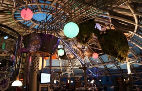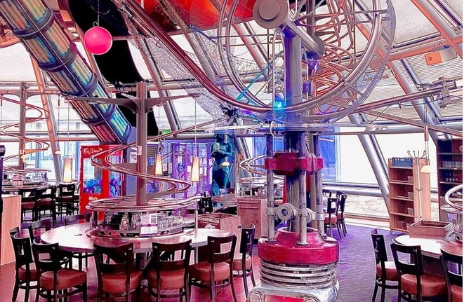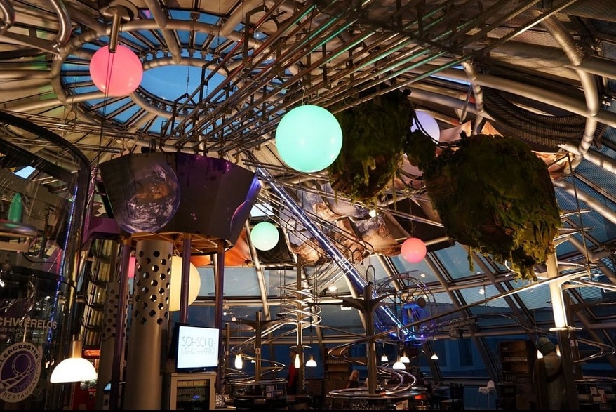 Abgefahren geht es zu im Achterbahnrestaurant „Schwerelos“ in Dresden: hier schweben Töpfe an der Decke und sausen in einer Spirale hinunter an den Tisch.