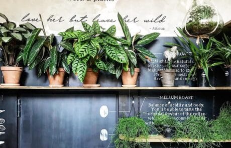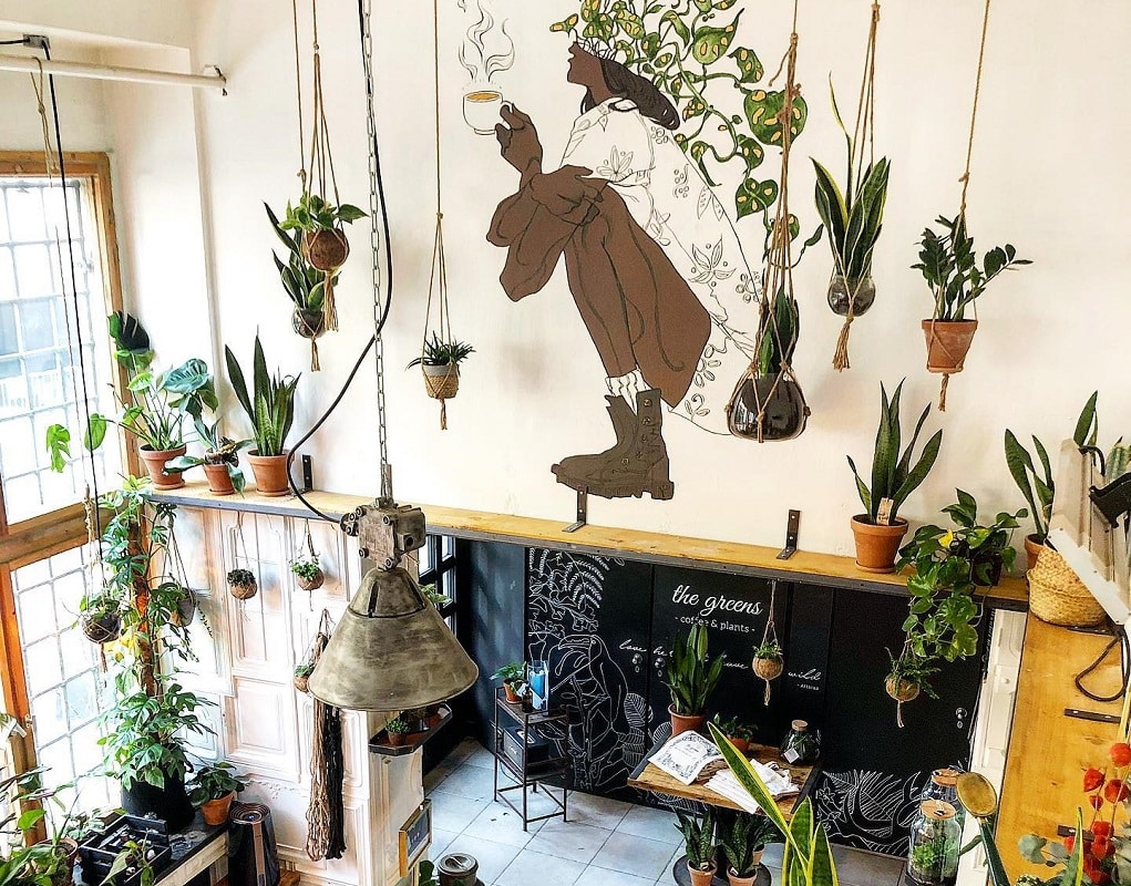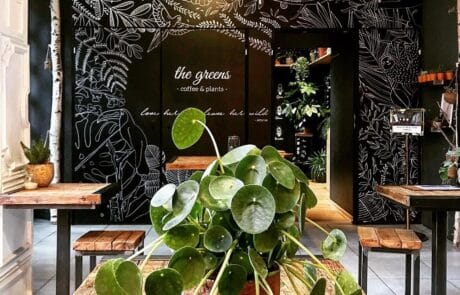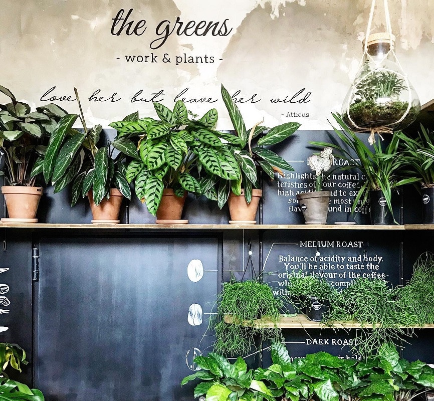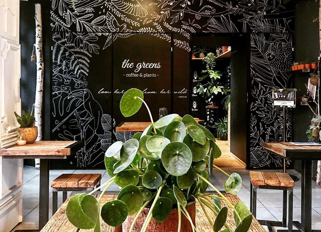 Inmitten eines Urban Jungle aus grünen Zimmerpflanzen kann man im The Greens in Berlin Kaffee trinken, Kuchen essen, seine Mittagspause verbringen – und zum Schluss eine oder mehrere der grünen Pflanzen mit nach Hause nehmen.