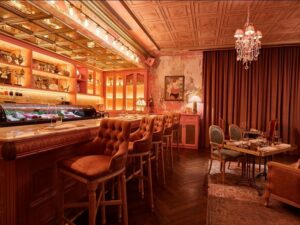 Kronleuchter, Plüschkissen, Samtsofas, Kassettendecken, Vasen und ein mit knallgelben Plastikenten gefüllter Brunnen in der Mitte des Raumes – das neue Restaurant The Pink Room in Berlin-Mitte geizt mit nicht extravaganten Details. Das Gourmetrestaurant ist direkt an die Bellboy Bar angeschlossen – in einem versteckten und maximal pompösen Raum, der eine skurril-plüschige Welt ganz in Rosa eröffnet. Die Macher hinter diesem neuen Glamour-Hotspot sind Spitzenkoch Gal Ben Moshe, der aus dem Restaurant Prism bekannt ist, wo er die Levante-Küche auf eine neue Gourmetstufe gehoben hat, und Bellboy-Küchenchef Paris Katsampis, im The Pink Room verantwortlich für die ungewöhnliche Fusionsküche aus levantinischen und japanischen Komponenten. Das Wilde der Levante-Küche trifft hier auf die Präzision Japans – meisterhaft zubereitet von Paris Katsampis, seines Zeichens Sushimeister mit langjähriger Expertise.