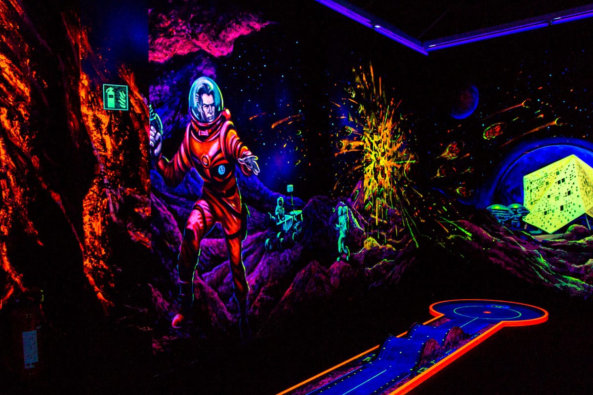Das 3D-Schwarzlicht-Indoor-Minigolf ist das ganze Jahr über ein unvergessliches Erlebnis für Jung und Alt. Die 18 Bahnen Minigolf bringen farbenfrohen Spaß der besonderen Art. So etwas hat man tatsächlich noch nicht gesehen. Die 500 Quadratmeter große Indoor-Minigolfanlage ist klimatisiert und in verschiedene Themenwelten eingeteilt. Lassen Sie sich entführen in spooky Unterwasserwelten, begegnen Sie Gnomen, Bären und Astronauten – und spielen Sie in drei Themenwelten und Themenräumen einfach mit 100 Prozent Spielspaß Minigolf. Info: Diese besonderen Minigolf-Anlagen sind in Asperg und in Schwäbisch Gmünd beheimatet.