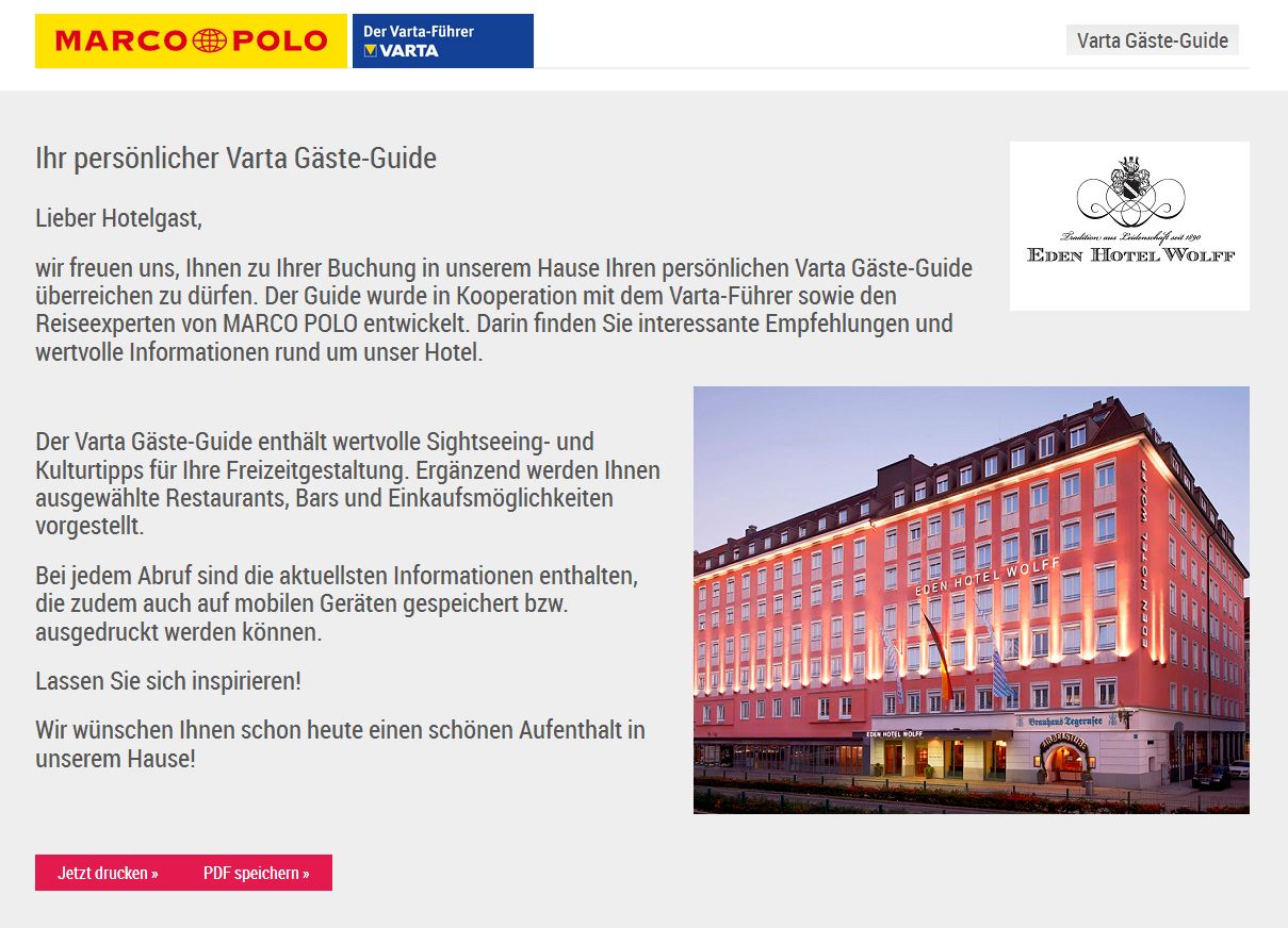 Ostfildern, 14.03.2016. Die Idee ist simpel, aber wirkungsvoll: Der Varta-Führer bietet den Hoteliers einen webbasierten Zusatzservice, der dem Gast bereits vor seiner Anreise zur Verfügung gestellt werden kann. Der Service beinhaltet für den Kunden einen direkt erkennbaren Mehrwert und beantwortet zudem häufig gestellte Fragen wie „Wo finde ich ein gutes Restaurant in der Umgebung?“ oder „Gibt es Sehenswürdigkeiten in direkter Hotelnähe?“. Das Resultat: der Varta Gäste-Guide.