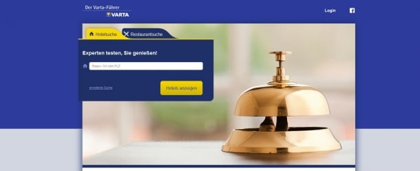 Über Varta-Guide: Im breiten Spektrum der Reisebuchungs- und Bewertungsplattformen im Internet nimmt der Varta-Guide eine Ausnahmestellung ein. Wie in der seit Jahrzehnten etablierten Print-Version (Varta-Führer) gelten Neutralität und Unabhängigkeit auch im Online-Portal als Grundlage der Hotel- und Restaurantbewertungen. Die Varta-Diamanten, das Label „Gut & Günstig“ und die beliebten Varta-Tipps werden auf der Basis anonymer Tests vergeben. Die im Frühjahr 2014 neu konzipierte Seite www.varta-guide.de bietet alle Funktionen eines modernen, serviceorientierten Web-Portals, das auch bei namhaften Unternehmen große Wertschätzung genießt. Reichweitenstarke Plattformen wie meinestadt.de, Gelbe Seiten, Deutsche Zentrale für Tourismus (DZT), GoYellow, Telegate, Pointoo oder Seeker sowie die Motor Presse Stuttgart sind Kooperationspartner und haben die Varta-Bewertungen in ihre Internetseiten integriert. So bietet sich den gelisteten Hotels und Restaurants ein attraktives Netzwerk provisionsfreier Vertriebsmöglichkeiten. Der gedruckte Varta-Führer erscheint auch weiterhin einmal jährlich im Verlag MAIRDUMONT.