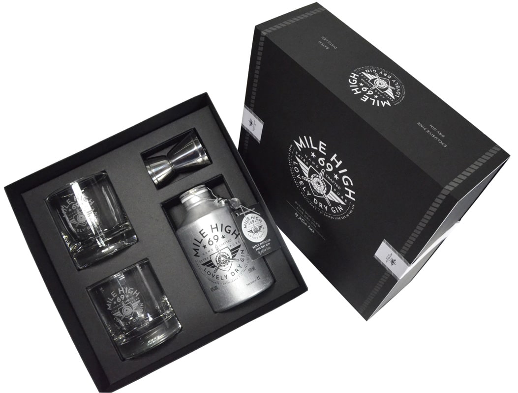 Sie erhalten den MILE HIGH 69® in einem exklusiven Geschenkkarton mit handverplombter 500ml Flasche (1 Liter = 84,00€) und kleinem Booklet, 2 hochwertigen Gin-Tumblern (30cl) sowie einem geeichtem Edelstahl-Cocktailmaß 2/4cl. In dieser Ausführung ist der auf 1000 Stk. limitierte Geschenkkarton exklusiv gefertigt und nicht im Handel erhältlich.
